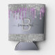 Un glacière pour une fête girly et glamour avec les filles. Un arrière - plan à l'aspect métallique faux argent avec élégante parties scintillant violet et faux argent gouttes, la peinture goutte à goutte. Personnalisez et ajoutez votre nom et votre lettre monogramme. Le nom est écrit en noir avec un script de style moderne écrit à la main avec des swashes. Lettres noir et gris. Pour que les swashes ne suppriment que le nom de l'échantillon, laissez les espaces ou émoticônes devant et après le nom.