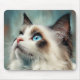 A close-up portrait of a Ragdoll cat with striking blue eyes. The cat has a fluffy, white coat and is wearing a black collar with a blue gemstone charm. The cat's eyes are wide open and focused on something off-camera, creating a sense of curiosity and wonder. The background is a soft, pastel blue with delicate pink blossoms scattered throughout, adding a touch of whimsy and elegance to the image.