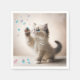 A fluffy ragdoll kitten with bright blue eyes plays with colourful bubbles lifting its paw in curiosity
