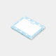 A lovely rainy day treat, these post it notes features a blue background with white clouds. Rain drops feel the area. In the middle is a blue and white box with a place to personalize your name inside. Purchase your post it notes today!