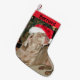 Cute photo of Rain, a sweet Weimaraner Dog, wearing a Santa hat on a Christmas Stocking. Text is easily customizable.