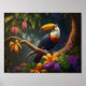 Toucan illustrated in the branches of trees surrounded by vibrant tropical flowers in a tropical rain forest.