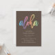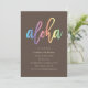 This party invitation features the word "aloha" in a rainbow handwritten script. Background colour and text fields are fully customizable.
