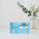 A cute business card eaturing a stunning vivid vector rainbow on a blue background. It curves to meet to white fluffy clouds on each side. The right cloud has a pink heart decorating it. It rain downs 4 yellow stars and 6 blue raindrops.