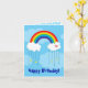 A Birthday card featuring a stunning vivid vector rainbow on a blue background. It curves to meet to white fluffy clouds on each side. The right cloud has a pink heart decorating it. It rain downs 4 yellow stars and 6 blue raindrops.