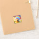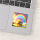 This sticker has a rainbow and a treasure pictured on it.