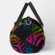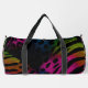 This image displays a duffel bag featuring a dynamic and mixed animal print pattern. The design incorporates both vibrant, multi-coloured zebra stripes on the right and left sides, and similarly colourful, textured leopard spots in the centre. The colours, including shades of pink, orange, yellow, green, and blue, appear as if applied with a textured or spray-paint effect, all set against a dark, presumably black, background. The bag is equipped with black carrying straps. This unique and edgy design creates a bold statement, perfect for those who love eclectic and vibrant accessories.