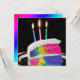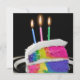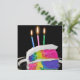 Birthday candles on a slice of rainbow cake on black for birthday party invitation.