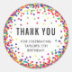 Rainbow Birthday Party Thank You Stickers with personalized text and colourful confetti around the edge