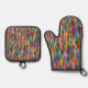 Bright and colourful pot holder and oven mitt set with a design of multicolored brushstrokes.