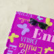 Cute little graphic outline butterflies personalized name beach towel. This purple, aqua blue, pink, lime green, yellow and cream text typographical towel can also be customized with your own short name, currently reads Emilia. Other names and colours available or contact me for name requests. Original art and design by Sarah Trett for www.mylittleeden.com