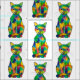 A painting of a rainbow cat. The cat has a fur pattern like a tortie, only in a lot more colours.