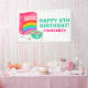 Are you planning a cereal theme party for your child? The Rainbow Cereal Birthday Party Banner designed by Enchantfancy Design Company features a bowl filled with milk and rainbow cereal alongside a pink cereal box with a rainbow on the front. Star accents add a fun touch to this adorable design. It is perfect for children's breakfast parties and pajama parties.