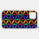 Abstract geometric design of interlacing circles, bright rainbow colors on black background