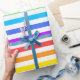 A wrapping paper designed with a striped pattern with bright rainbow colors and white.