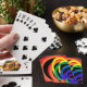 This bold, colourful deck of playing cards displays an abstract three dimensional pattern of rainbow crescent moons in colours of red, orange, yellow, green, blue and purple on a black background.