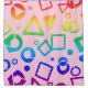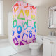 The shower curtain has a Striking graphic of cubic shapes in rainbow colours starting with red in the top green along the middle and blue and purple in the bottom. It’s a striking addition to any bathroom, but wants to make a statement. The overall background is pink.