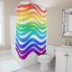The shower curtain has a bold thick wavy line drawn horizontally across the curtain. It's in rainbow colours starting with red in the top green along the middle and blue and purple in the bottom. It’s a striking addition to any bathroom, for anyone who wants to make a statement. The overall background is white.