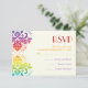 Rainbow colours damask wedding RSVP response/reply card that features a damask motif in rainbow colours on ivory background. This modern yet classic design is a template and is part of a wedding set suitable for a spring, summer of fall wedding with a rainbow theme. It is customizable and can be personalized. Colours: Red, orange, yellow, green, blue, violet purple, ivory.