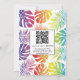 Rainbow colours pattern of tropical leaves gay lesbian wedding invitation with QR code on the back to RSVP online. It features a colourful pattern of tropical monstera and palm leaves in rainbow colours and your text in a frame with black border. Your names are in script typography while the back includes the QR code to RSVP online.