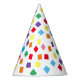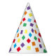 Rainbow confetti party hat featuring a cheerful print of bright coloured square and diamond confetti shapes. Perfect festive paper cone hat for a girl or boy's birthday party. Bright and cheerful pretty patterned hat to bring joy to your event.