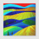 An abstract landscape of rolling hills in bright vibrant colours with angular lines.