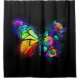 Rainbow, luminous, artistically painted monarch butterfly with bouquet of iridescent, bright, luminescent roses on black background. Rainbow butterfly.
