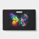 Rainbow, luminous, artistically painted monarch butterfly with bouquet of iridescent, bright, luminescent roses on black background. Rainbow butterfly.