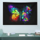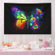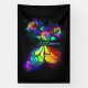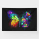 Rainbow, luminous, artistically painted monarch butterfly with bouquet of iridescent, bright, luminescent roses on black background. Rainbow butterfly.