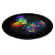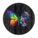Rainbow, luminous, artistically painted monarch butterfly with bouquet of iridescent, bright, luminescent roses on black background. Rainbow butterfly.