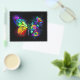 Rainbow, luminous, artistically painted monarch butterfly with bouquet of iridescent, bright, luminescent roses on black background. Rainbow butterfly.