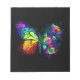 Rainbow, luminous, artistically painted monarch butterfly with bouquet of iridescent, bright, luminescent roses on black background. Rainbow butterfly.