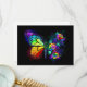 Rainbow, luminous, artistically painted monarch butterfly with bouquet of iridescent, bright, luminescent roses on black background. Rainbow butterfly.