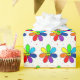A tiled pattern of rainbow flowers on a colourful dotty background.