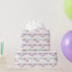 Two smiling giraffe faces, one wearing purple flowers and the other wearing pink flowers, are just below a sparkling multi colour rainbow on this birthday gift wrapping paper. Add a lavender and purple bouquet and your custom text in teal, and placed on a white background, you have a pretty wrapping paper for just about anyone.