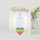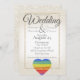 This beautiful, classy wedding invitation features a faux ivory gold glitter frame. The glitter appears more dense near the edges and gradually fades toward the centre. A rainbow glitter heart appears near the bottom of the invitation. The colours represent the iconic rainbow and gay pride or LGBTQ flag. An ivory gold frame borders the text portion of the invite.