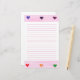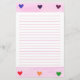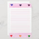 This stationery is perfect for Valentines and Anytime. There are six hearts in all, painted in the colours of the rainbow on a blended pink background, featured at the top and bottom of the stationery. The centre writing area features pink lines on a white background. The hearts are red, orange, green, blue, violet, and purple.