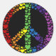 This design features small, medium and large hearts in rainbow colours arranged in the shape of a peace sign, on a black background.