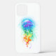 Large, iridescent, artistically drawn, bright jellyfish, with long tentacles on white, painted over with multicolored watercolor background. Rainbow jellyfish.