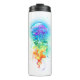 Large, iridescent, artistically drawn, bright jellyfish, with long tentacles on white, painted over with multicolored watercolor background. Rainbow jellyfish.