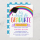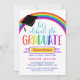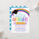 Colourful graduation party invitation with a graduation cap-wearing rainbow, fun typography, and a blue and white cloud pattern.