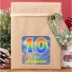 This exciting, eye-catching, and vibrant birthday-themed sticker design features a cloudy blue sky pattern background, a large number "10" and "HAPPY BIRTHDAY," both having a multicolored rainbow spectrum inspired gradient pattern, and a custom name. Happy and colourful stickers like this might be used when wrapping gifts being given to somebody who is celebrating their tenth birthday. [~Z0000374]
