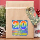 This vibrant, eye-catching, and exciting birthday-themed sticker design features a blue sky with clouds pattern background, a large number "20" and "HAPPY BIRTHDAY," both having a multicolored rainbow spectrum inspired gradient pattern, and a customizable name. Fun and colourful stickers like this might be used when wrapping presents being given in celebration of somebody’s twentieth birthday. [~Z0000374]