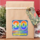This vibrant, exciting, and eye-catching birthday-themed sticker design features a cloudy blue sky pattern background, a large number "30" and "HAPPY BIRTHDAY," both having a multicolored rainbow spectrum inspired gradient pattern, and a customizable name. Fun and colourful stickers like this might be used when wrapping gifts being given to somebody who is celebrating their 30th birthday. [~Z0000374]