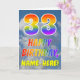 This fun and colourful 33rd birthday greeting card design features a depiction of a blue sky with clouds, along with a large number "33" and the message "HAPPY BIRTHDAY," having a rainbow spectrum inspired gradient pattern colouring, on the front. The front also features a custom recipient name. The inside features a customized birthday greeting message, or could perhaps be cleared and left blank if a message is to be written by hand instead. A personalized birthday card like this might be a fun way to acknowledge somebody’s thirty third birthday. [~Z0000371]