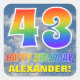 This eye-catching, fun, and vibrant birthday-themed sticker design features a blue sky with clouds pattern background, a large number "43" and "HAPPY BIRTHDAY," both having a multicolored rainbow spectrum inspired gradient pattern, and a custom name. Colourful and happy stickers like this might be used when wrapping presents being given in celebration of somebody’s 43rd birthday. [~Z0000374]