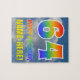 This fun, eye-catching, and exciting birthday themed puzzle design features a cloudy blue sky pattern background, a large number "64" and "HAPPY BIRTHDAY," both having a multicolored rainbow spectrum inspired gradient pattern, and a customizable name. A caring, colourful, and editable birthday puzzle like this might be a fun way to send birthday wishes to somebody who is celebrating their 64th birthday. [~Z0000375]