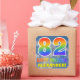 This eye-catching, fun, and vibrant birthday-themed sticker design features a cloudy blue sky pattern background, a large number "82" and "HAPPY BIRTHDAY," both having a multicolored rainbow spectrum inspired gradient pattern, and a custom name. Colourful and fun stickers like this might be used when wrapping presents being given in celebration of somebody’s eighty second birthday. [~Z0000374]