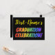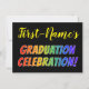 This fun, vibrant graduation celebration invitation design features a personalized name, and the message "GRADUATION CELEBRATION!" with letters having a rainbow spectrum inspired gradient pattern. The back features personalized information about the graduation celebration event. Invitations like these might be used to invite guests to a party or celebration being held for somebody who has just gradated from high school, college, university, or some other program of study.