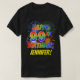 The front of this fun, vibrant and eye-catching birthday-themed shirt design features a colourful pattern inspired by celebratory fireworks, along with the message "HAPPY 99TH BIRTHDAY" featuring a multicolored rainbow like gradient pattern, and a personalized name coloured yellow. A fun, happy shirt like this might be worn by the guests at a birthday party being held in celebration of somebody’s ninety ninth birthday. [~Z0000356]